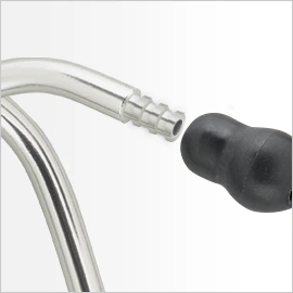To remove the old ear tips from your stethoscope you will need to pull them firmly until they pop off. When installing the new ear tips you need to push the metal tubing through the small hole on the ear tip until it is past all the three ridges to ensure a tight and secure acoustic seal as demonstrated below.