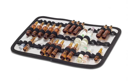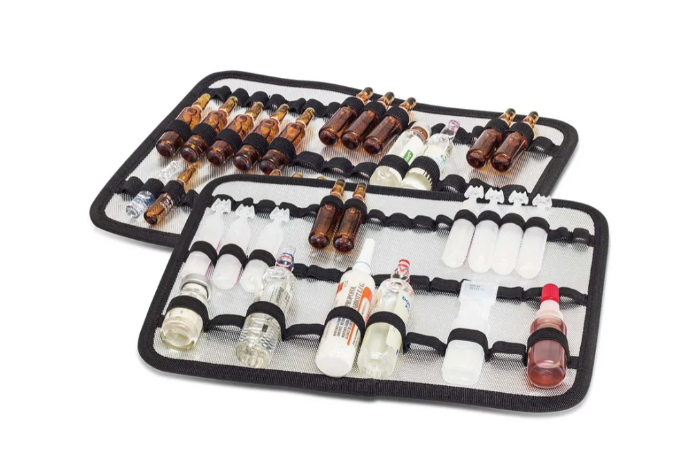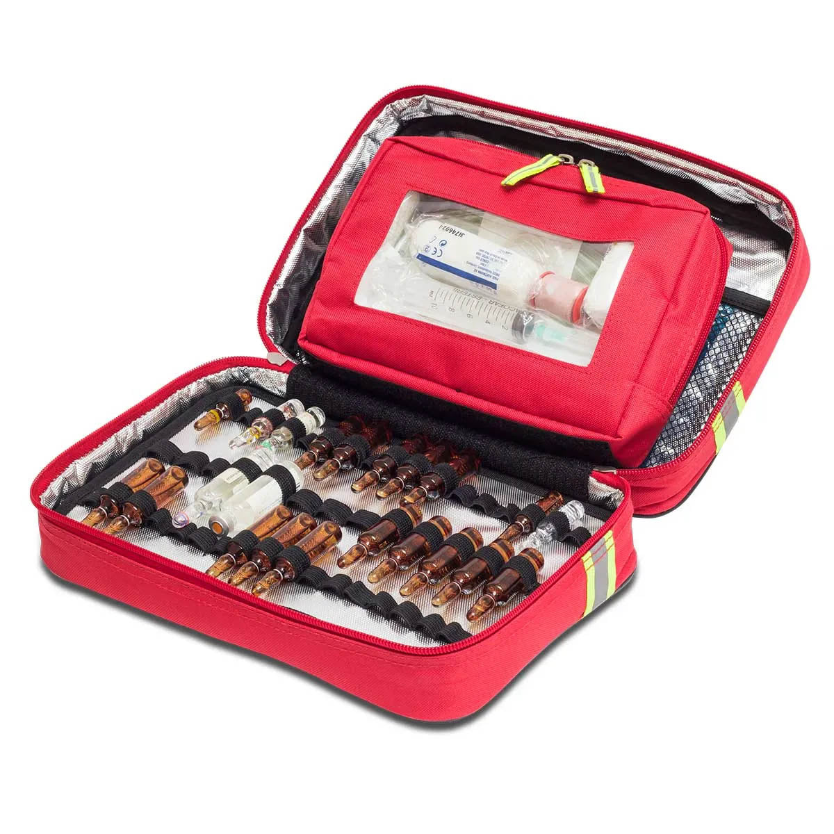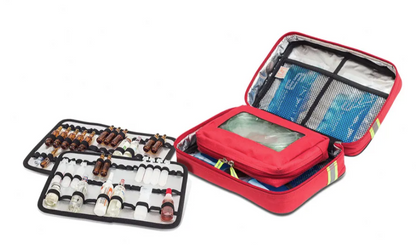 Two removable internal ampule trays are fitted with elasticated strapping designed to support a range of ampule sizes. A removable zipped and clear fronted equipment pouch can be used to store additional materials such as syringes, needles and sterile wipes.