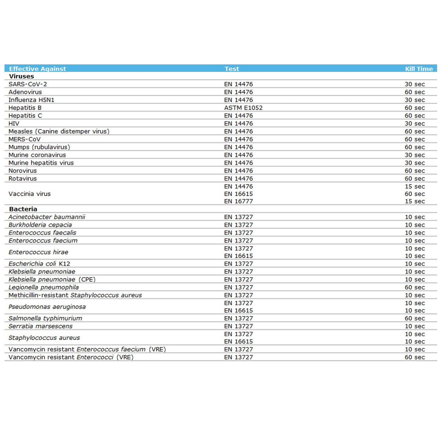 | SARS-CoV-2 | EN 14476 | 30 sec |