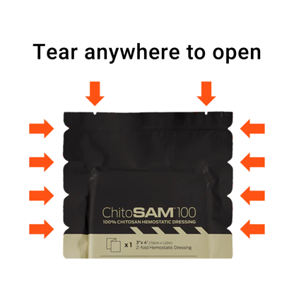 TEAR ANYWHERE PACKAGING - The innovative, tear-able from any side packaging allows for quick access to ChitoSAM™ to treat and cover wounds quicker.