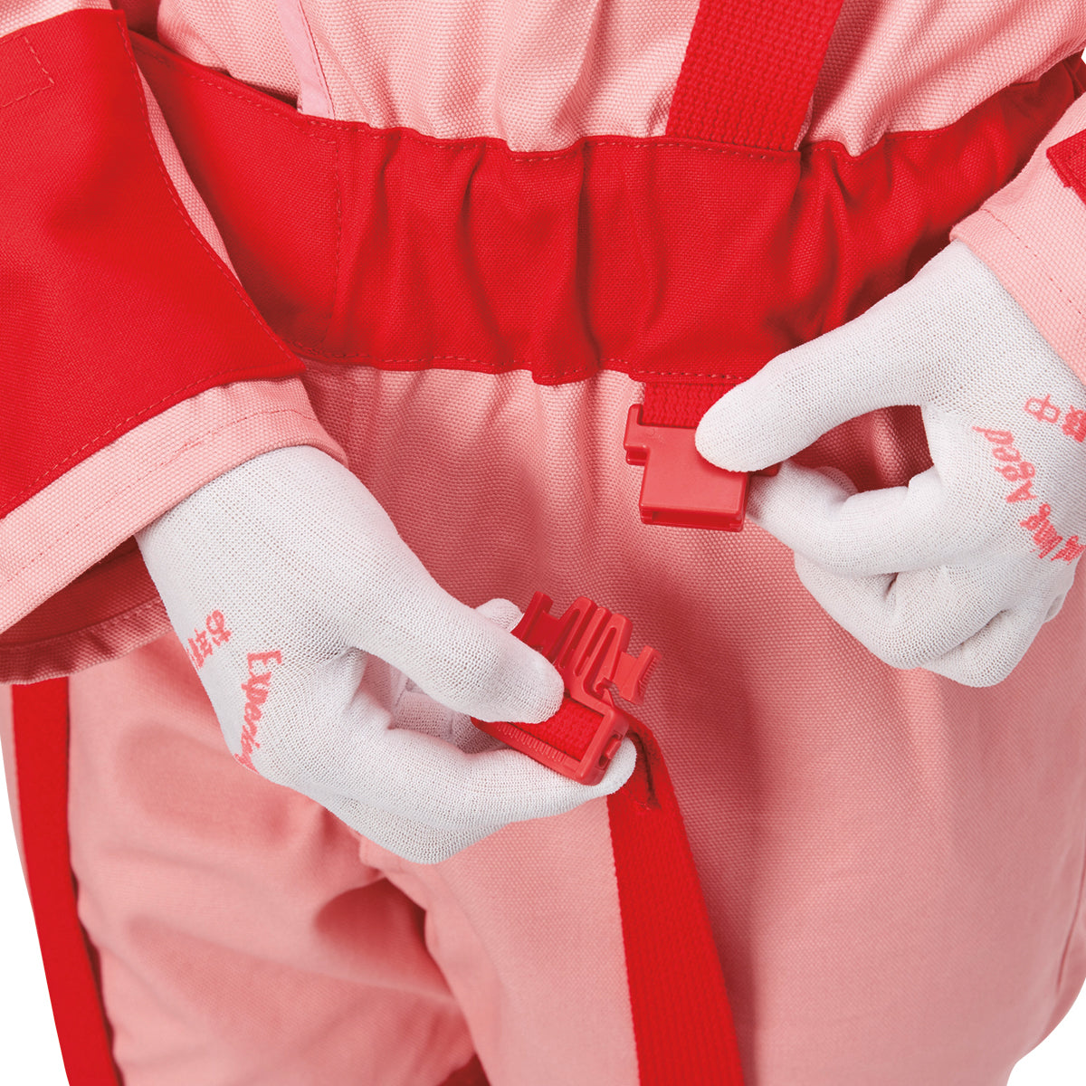 It takes only about 3 minutes to put on the suit. This body suit type gear worn like overalls allows students to experience restrictions in physical functions with little loss of time.