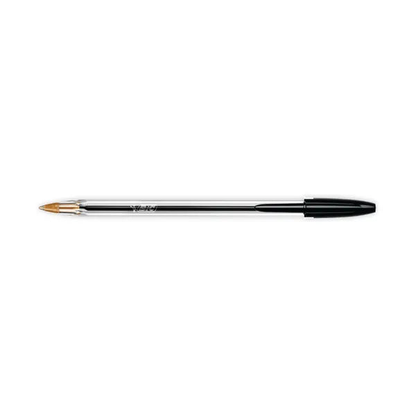 These Bic Cristal Ballpoint Pens feature a durable tungsten carbide ball mechanism and smooth oil-based ink for reliable, everyday use. The medium 1.0mm tip produces a thin 0.4mm line for elegant handwriting and detailed sketching. The hexagonal barrel includes a black cap and end plug that matches the ink for easy identification. This value pack contains 100 black pens.