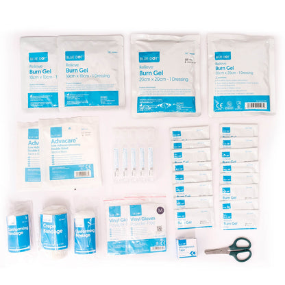The Blue Dot Extra Burns Kit is effective for use at work or home and provides effective relief from a variety of burns including, scalds and sunburn.