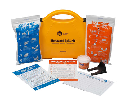 Urine and vomit cleaning packs are used to clean and decontaminate areas where spillages of urine and vomit have taken place. The single use pack is supplied with all PPE, GV Biocide Granules and disinfectant surface wipes. GV Biocide Granules are safe to use on acidic spills and have a high absorbency to mass ratio with 100g absorbing up to 7 litres of liquid. GV Biocide Granules ensure easy collection and removal of a urine or vomit spill and contain Triclosan an organic anti-bacterial agent. Disinfectant wipes are provided to wipe down the surface and surrounding area where spillages have occurred and remove any remaining residue. The small pack makes it easy to keep ready for use in all areas and ensure accessibility where it may be needed.