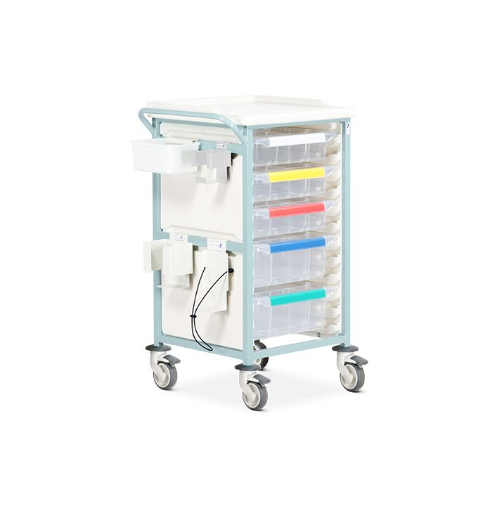 - Ergonomic push handle fitted to one side of the trolley ensures correct posture & keeps feet away from the frame, ideal for mobile phlebotomy or in cases where the trolley is wheeled for long periods of time