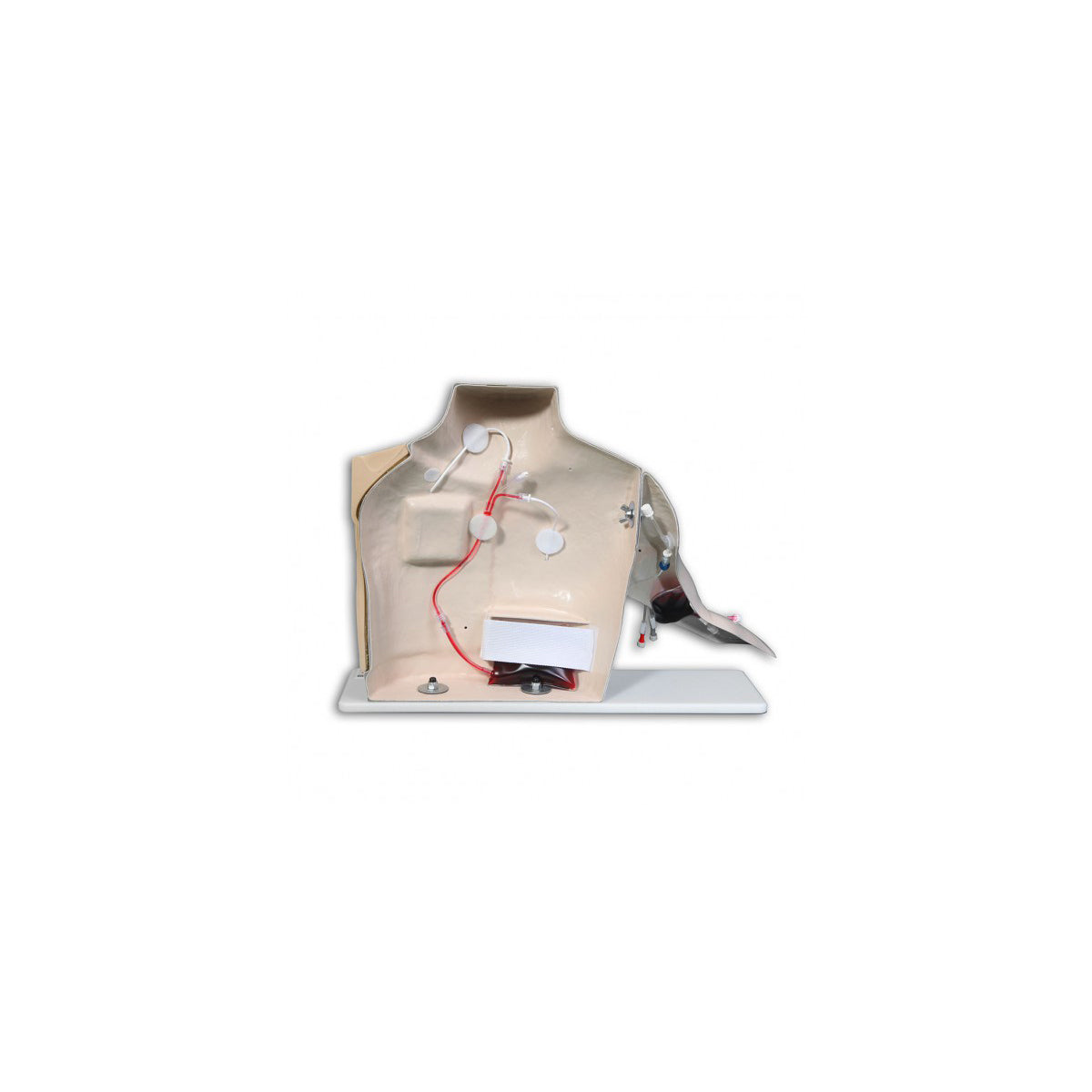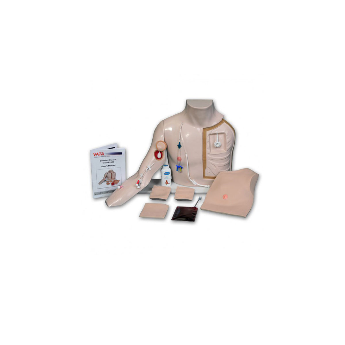 Chester Chest™ has been an industry standard since it was developed by VATA in 1986 for the teaching of central line care. The right chest area of the Chester Chest™ model has a 9.6Fr tunneled central catheter that is visible up to the clavicle. The Dacron cuff on this catheter is also discernable. The external jugular vein is slightly raised with an opening to attach a triple lumen catheter. There is also an opening in the upper chest area for placement of a subclavian catheter.