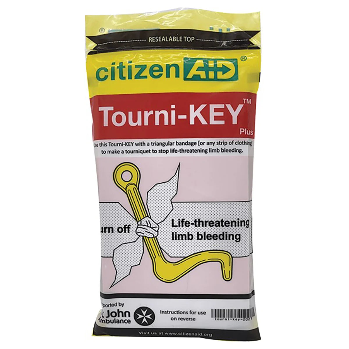 Designed and manufactured by citizenAID®, the new Tourni-Key PLUS combines a novel tough plastic lightweight device, a triangular bandage to act as an effective tourniquet to stop severe bleeding from an injured limb and an anti-pinch card to stop skin bunching.