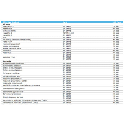 | SARS-CoV-2 | EN 14476 | 30 sec |