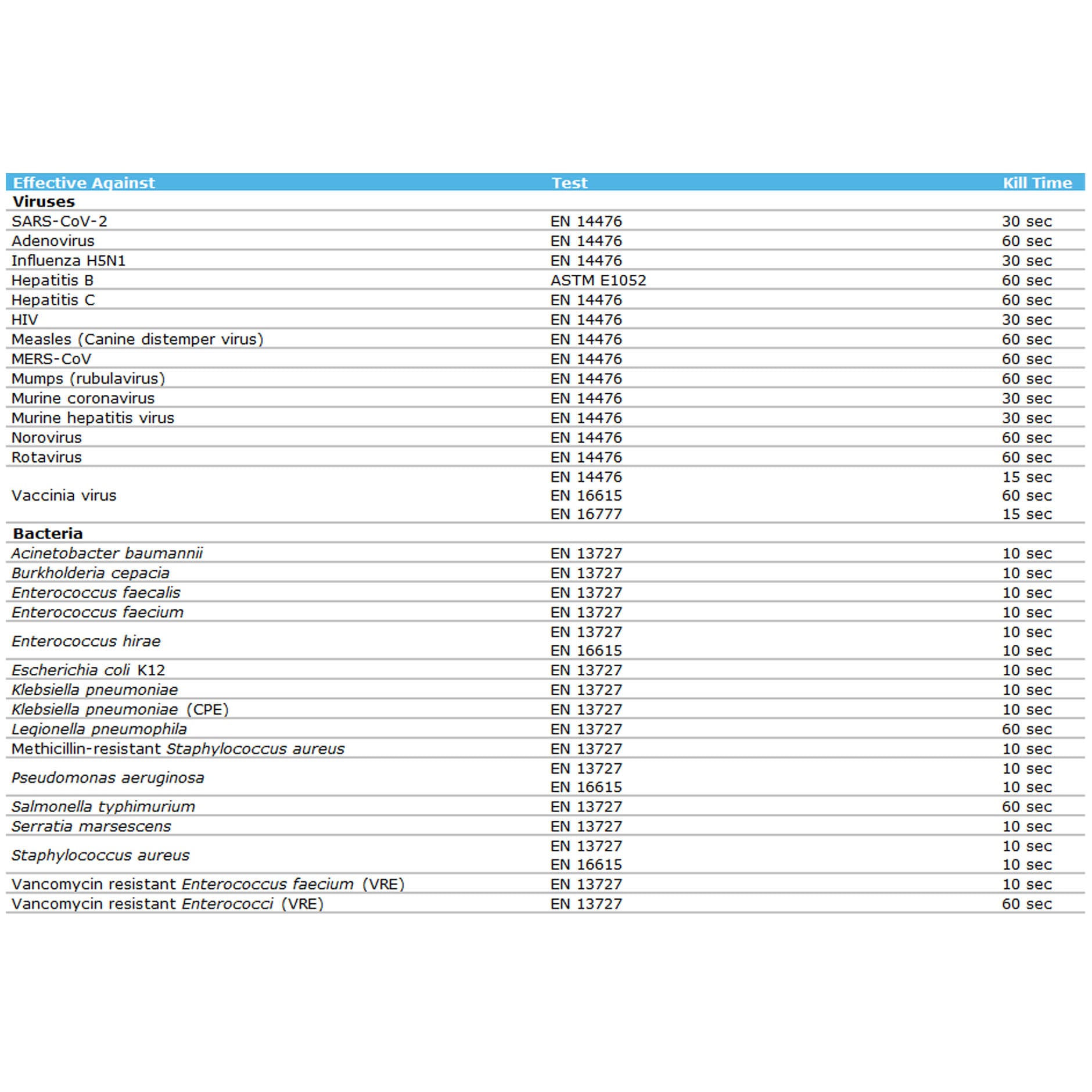 | SARS-CoV-2 | EN 14476 | 30 sec |