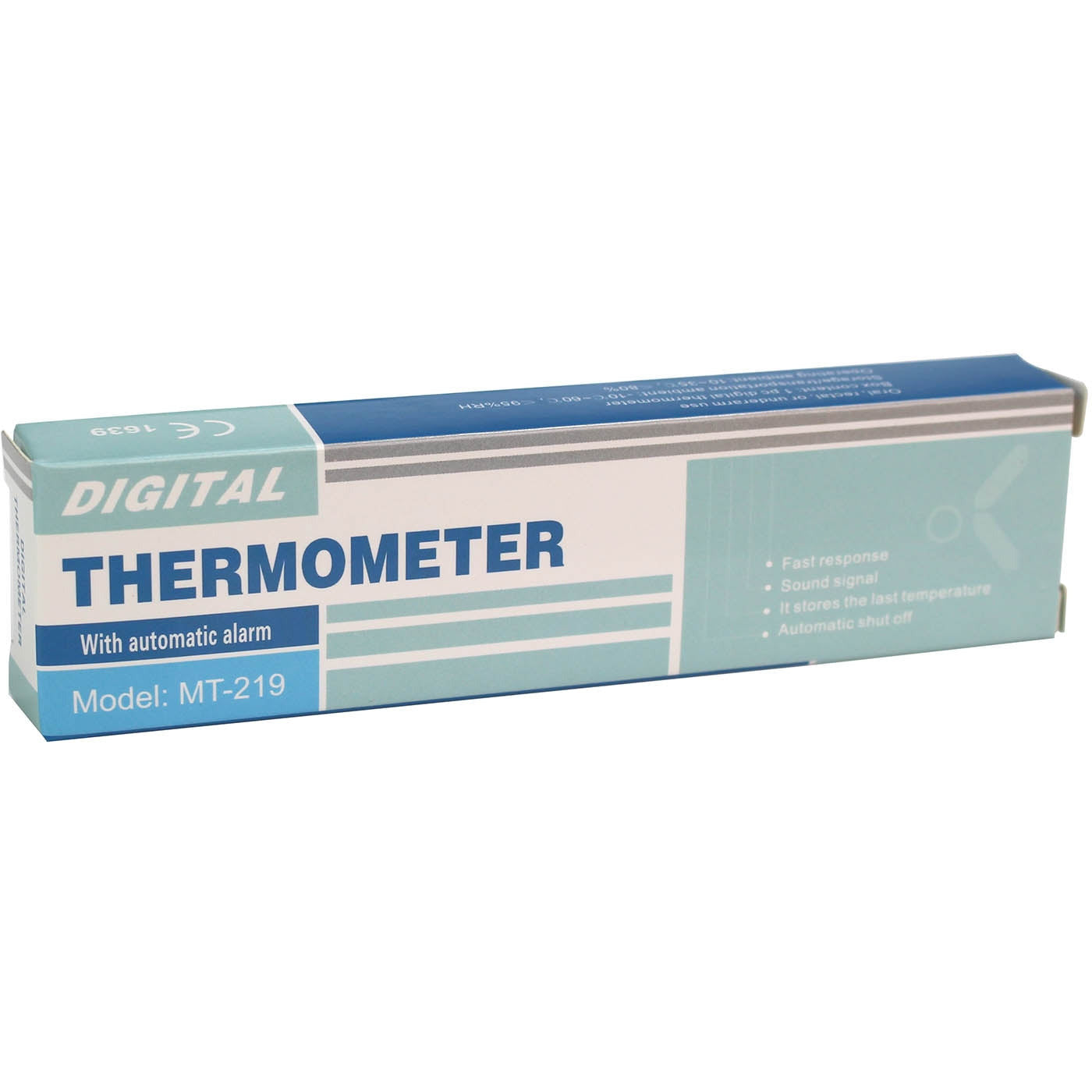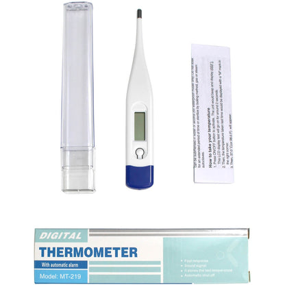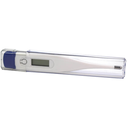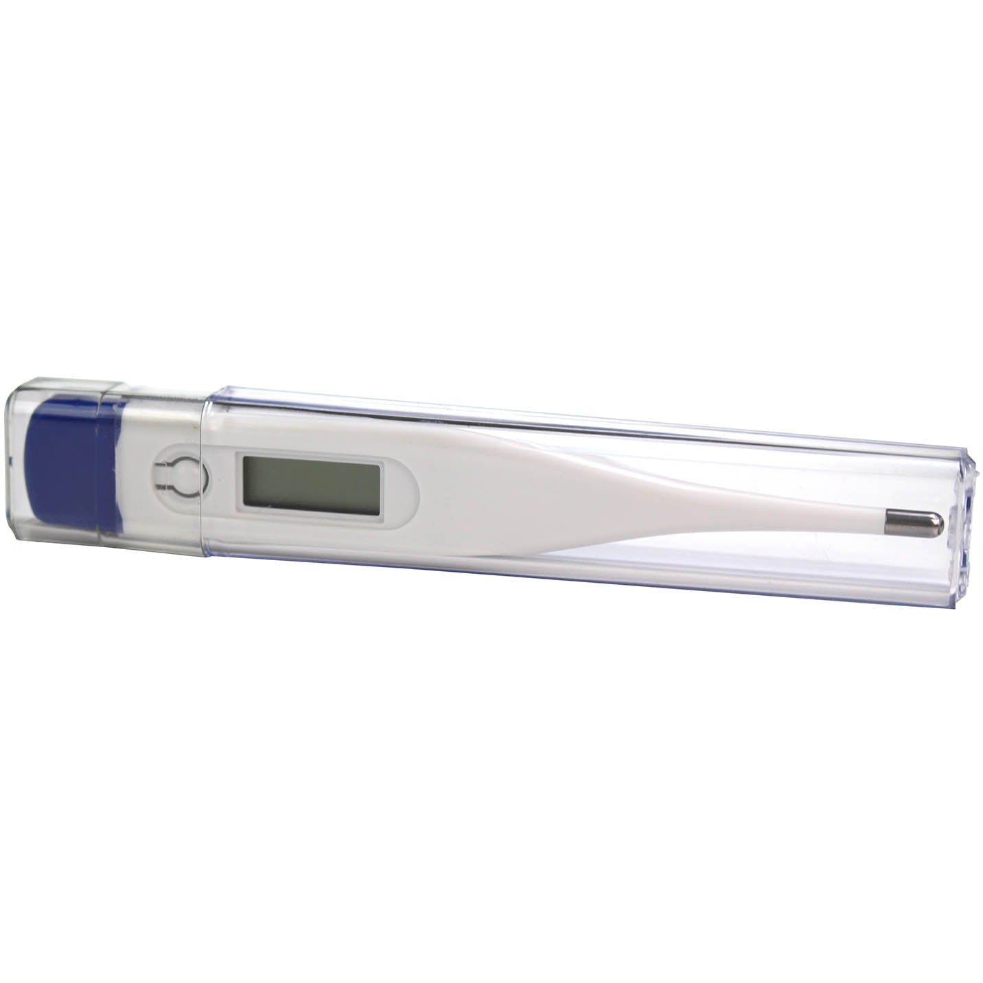 A basic digital thermometer, also comes with a storage tub and instruction manual.