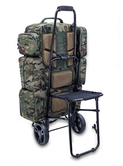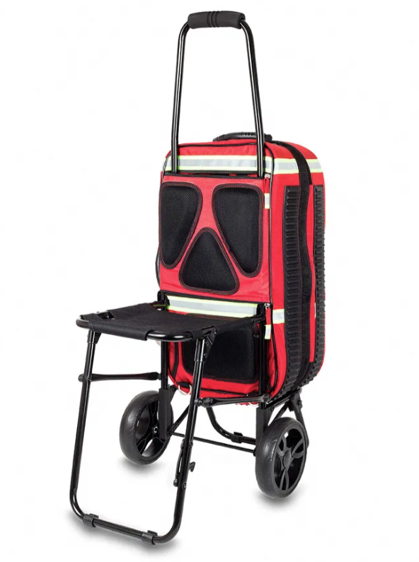 Designed to assist in the tasks of transportation of different backpacks and / or bags and other medical materials needed in various rescue scenarios. It can be folded and stored in small spaces (even inside the backpack). It includes big size wheels for a better portability, even in uneven ground. Thanks to its built-in seat, it allows to carry out diagnostic interventions or “in situ” cures, as well as have a rest during long walks.