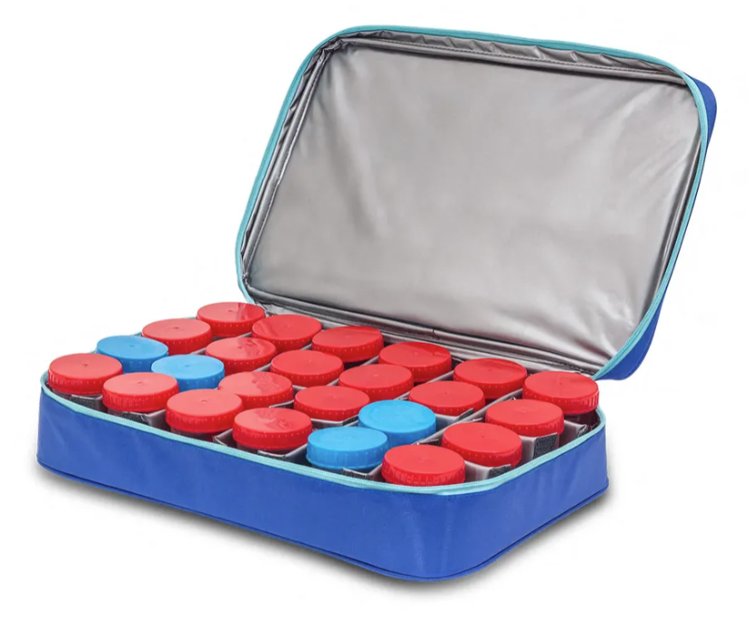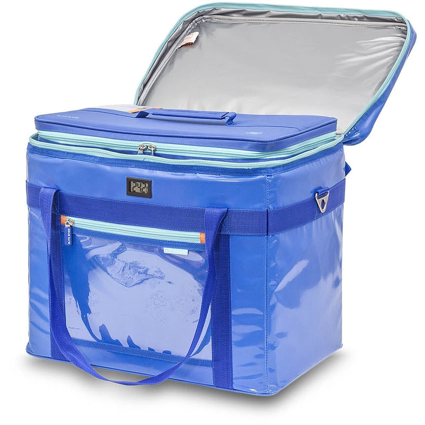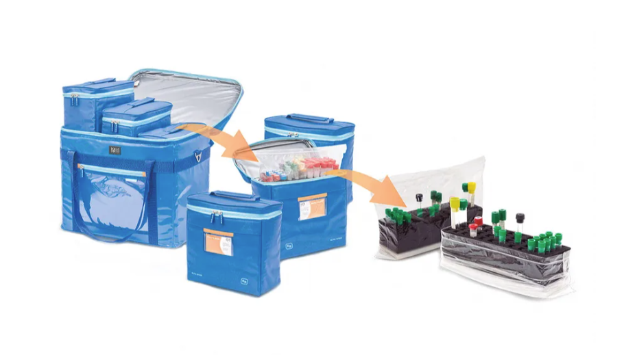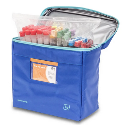 High capacity isothermal bag that allows the transport, in an organized way and under optimal conditions, of 300 diagnostic samples and 36 urine samples, from the extraction center to the laboratory.