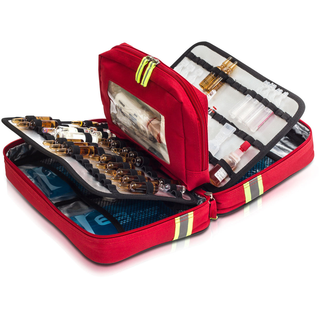 - 3 elastic bands across the length of the bag are completely adjustable - faclitating easy insertion of ampoules of varying sizes. The bands can then be tightened ensuring secure transport.