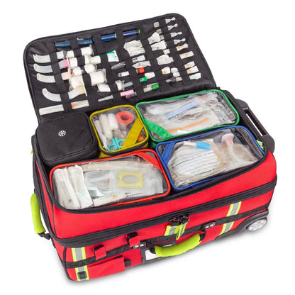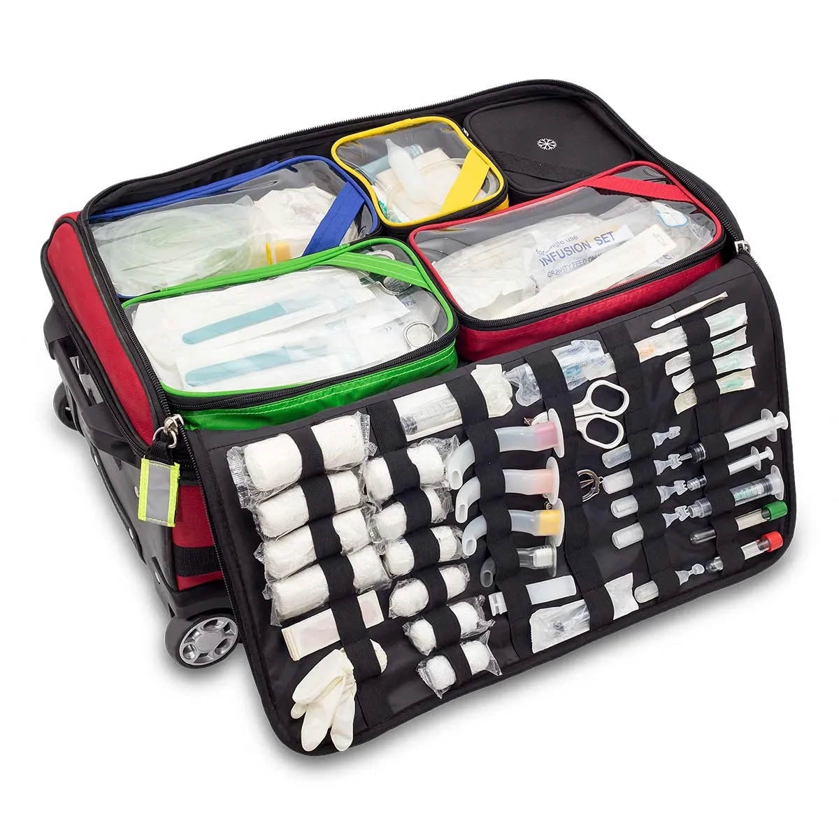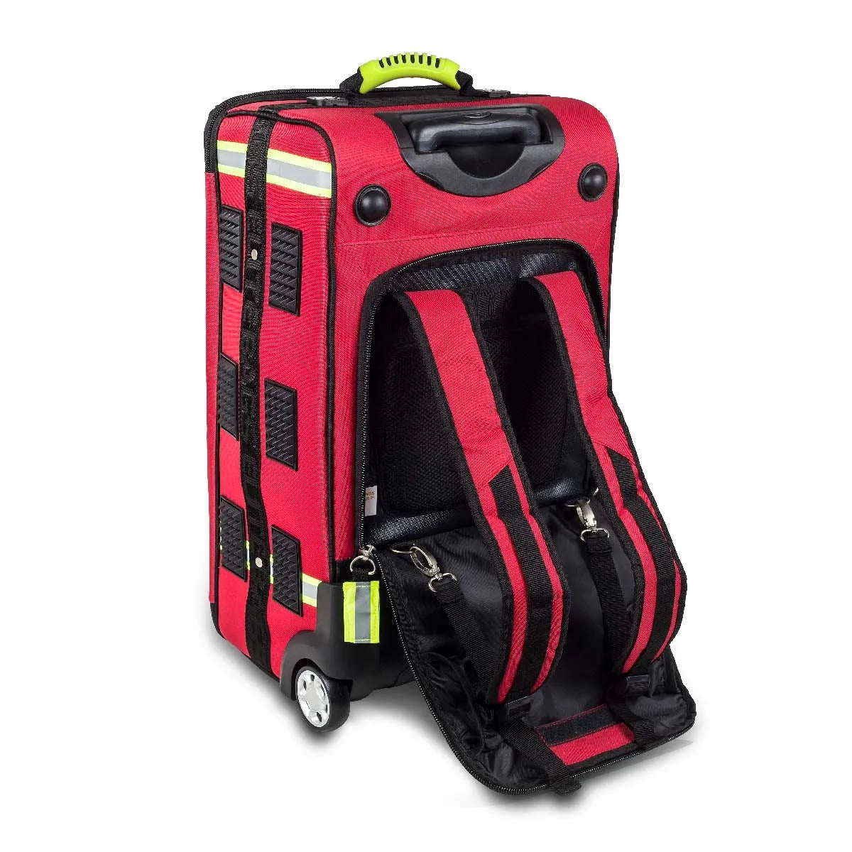 This large medical response bag can be used as a backpack, it can be towed on its built-in wheels or it can be carried conventionally by either of its two ergonomic handles. The medical backpack features a concealed shoulder strap system to avoid snagging when not in use. Likewise, the telescoping handle can be tucked away neatly in a side pocket when not required. The bag opens like a clam shell, allowing instant access to the main compartment and the three transparent, zippered compartments. The bag also features an outside pocket with 4 quick-release, colour-coded equipment pouches with transparent windows to allow easy identification of the contents, and on the other side you will find elasticated loops on an equipment board to secure your smaller supplies.