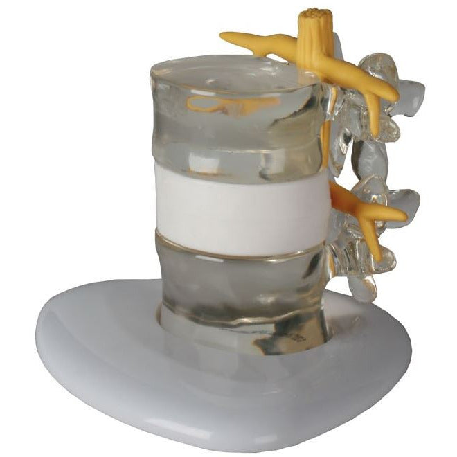 This model of two lumbar vertebrae in about double life size has the opportunity to demonstrate a lateral intervertebral disc hernia. If the two vertebrae are pressed together, the inner core of the disc will be protruding to the outside, forming a hernia. The protruding hernia shows graphically the pressure which affects the spinal nerve. With this helpful tool you can demonstrate fast and easily what happens when a patient suffers from a herniated disc. Because of the enlarged size it is easy to handle and also suitable for group teaching.