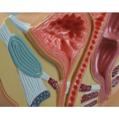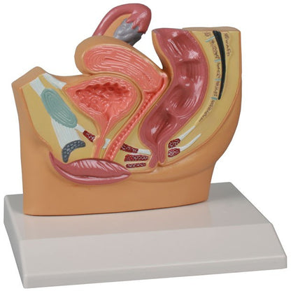 Median section of a female pelvis reduced to about half life size. Representation of female reproductive system, bladder, urethra and rectum.