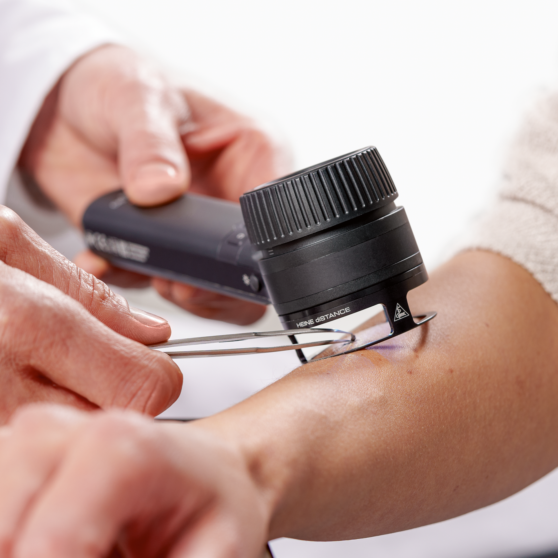 The working ring enables the user to examine and manage a lesion under magnification by maintaining a constant distance between the skin and the dermatoscope without contact. The HEINE Distance is used instead of the regular contact plate.