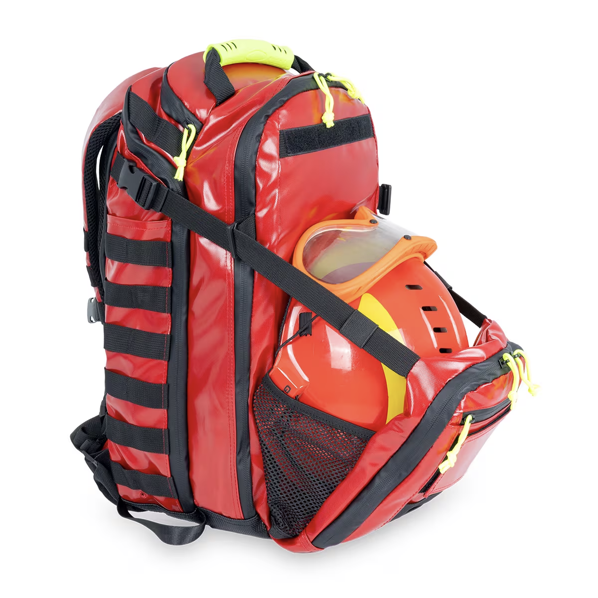 A robust and functional backpack designed for carrying helmets and essential equipment in emergency situations. Ideal for firefighters and rescue personnel who need quick access to their tools.