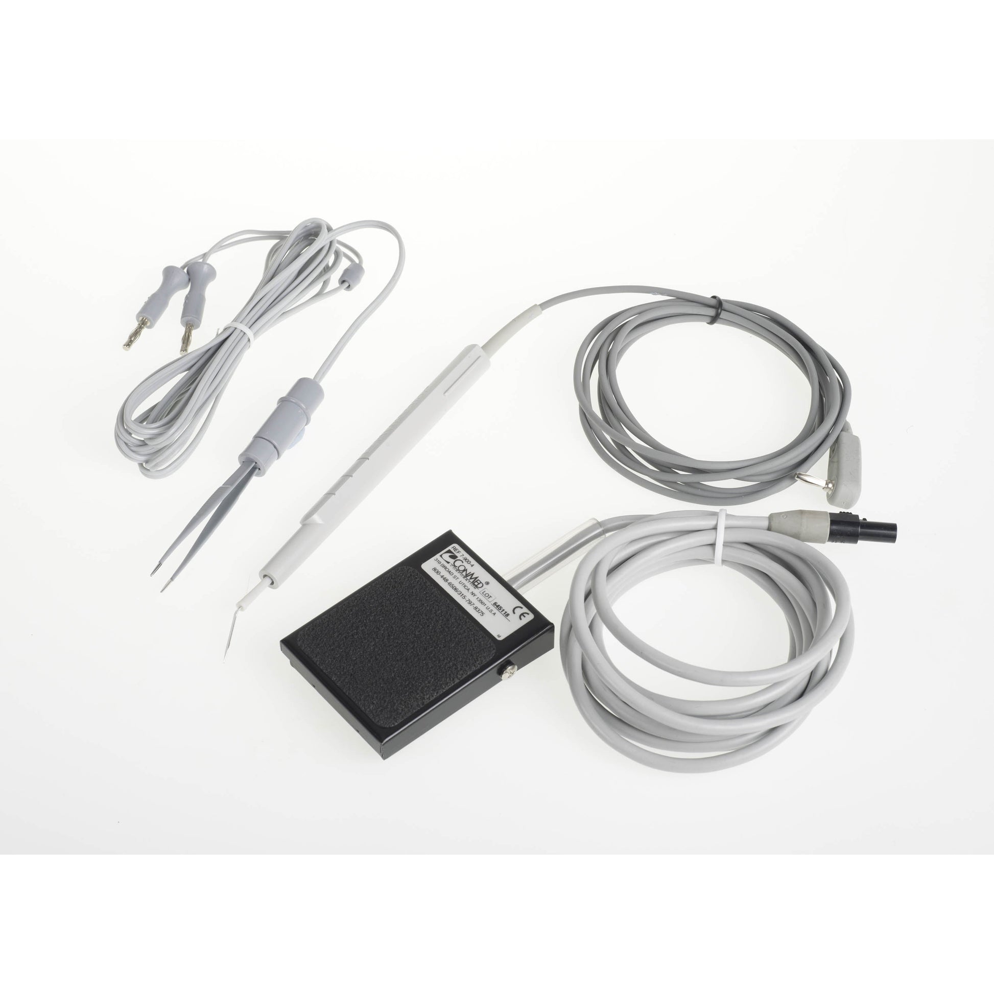 Solid state electrodessication, fulguration and coagulation. 0-35 watts monopolar and bipolar. Includes reusable up/down hand switching pencil, starter box of non-sterile electrolase tips (blunt & sharp), wall mounting kit, operators manual and training videos + FSB kit (comprising Footswitch, Universal Handle & Cord + Bipolar Forceps and cable).