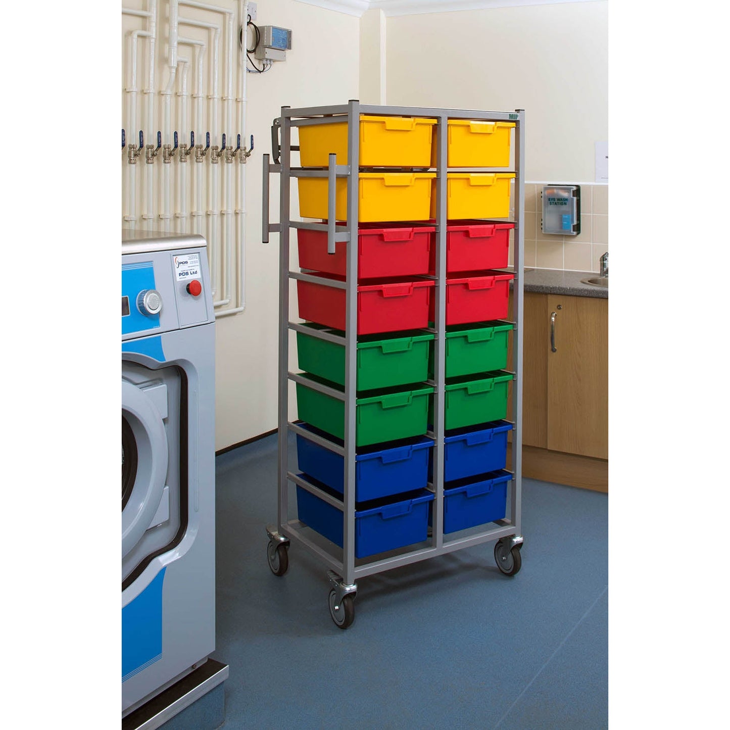 These Karri-Carts are designed as sturdy stacking units for the distribution of clean personal clothing. The Karri-Carts are made from a light weight, high quality MRSA resistant powder coated steel. They come complete with a selection of coloured trays for ease of sorting as well as a robust hanging rail to transport products on hangers