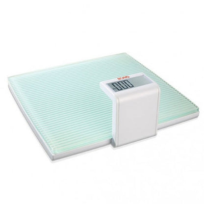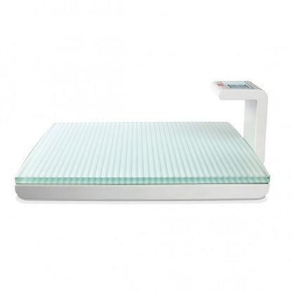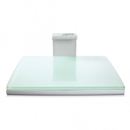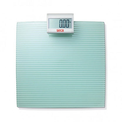Flat scale by Seca with low, elegant pedestal! This scale is made especially safe by the fine grooves on the safety glass plate and high scratch resistance provided remove