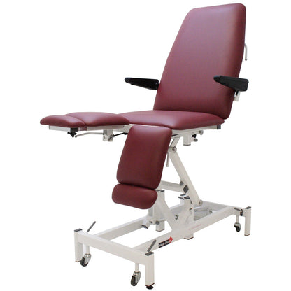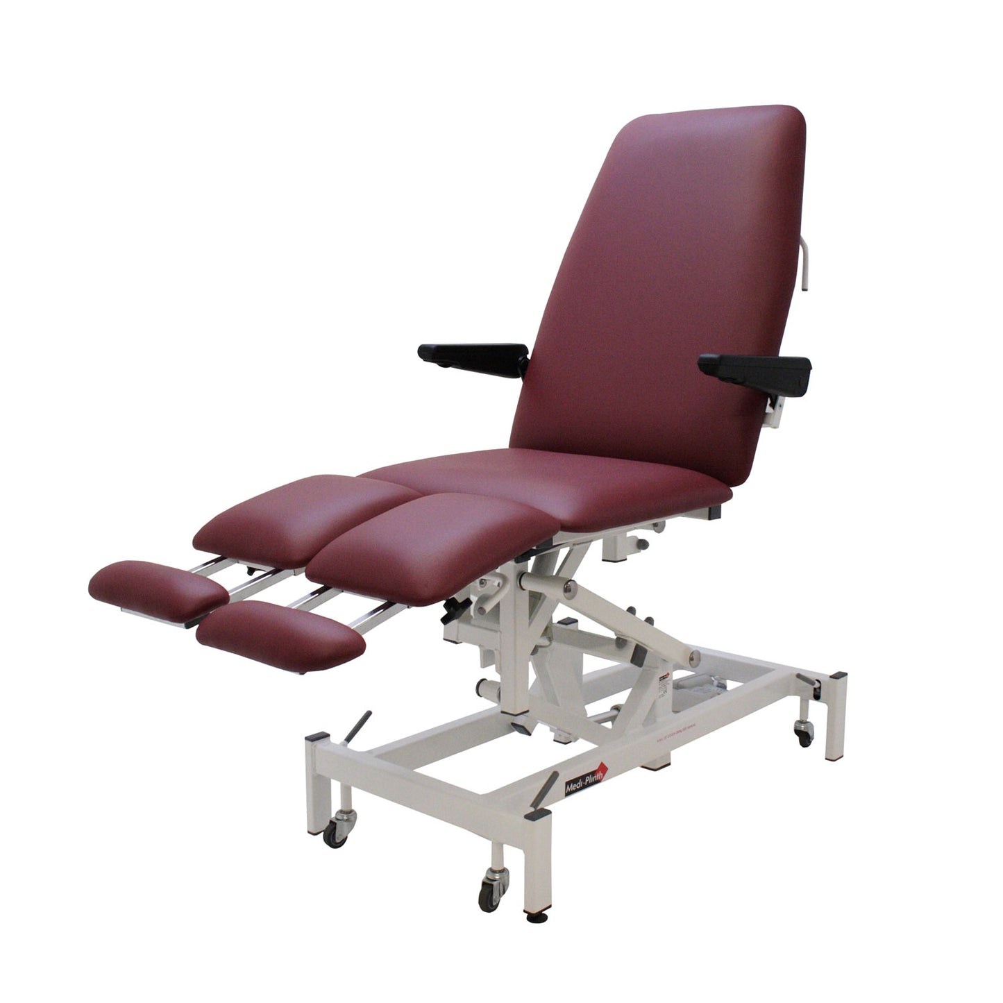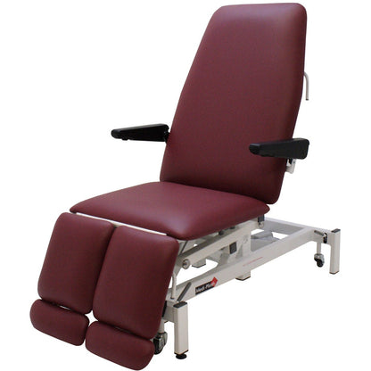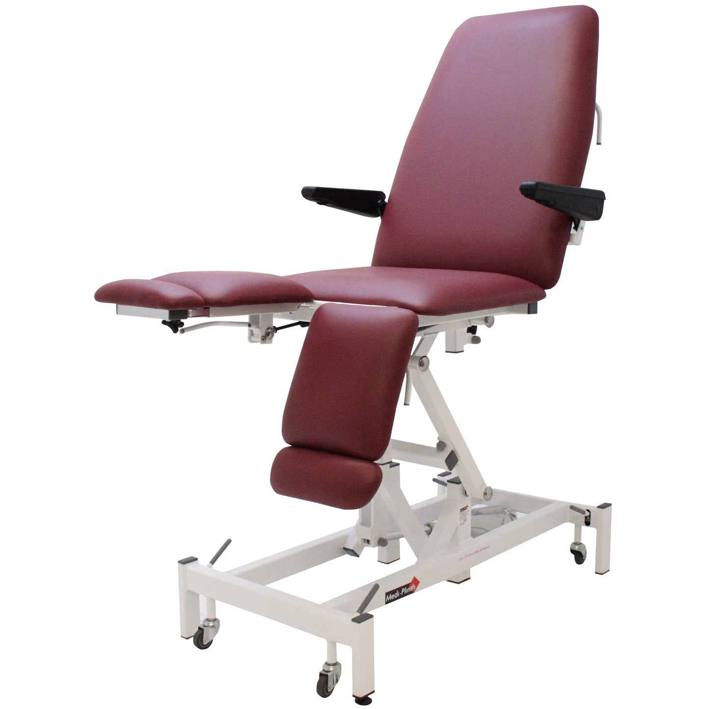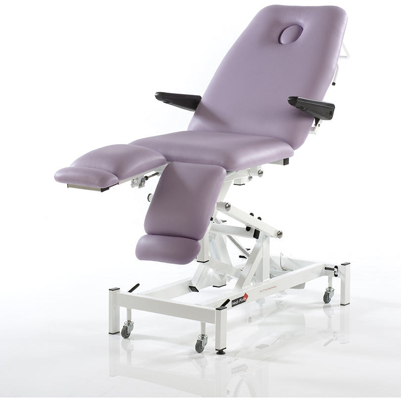 Medi-Plinth’s podiatry chair focuses on patient comfort, with armrests, thicker padding in the upholstery and a long backrest that reaches head height. In addition, the mid section on the tilting podiatry tilts to create a very natural seated position with the knees raised, whilst providing a better position for the practitioner.