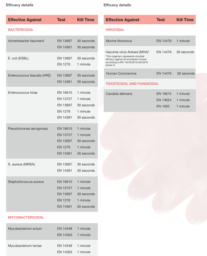 - Efficient solution release – active wipe ingredients are transferred to the surface rather than being trapped in the wipe material fibres.