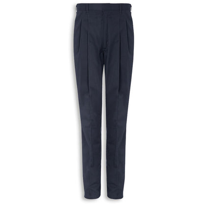 Men’s pleat front trousers in soft-brushed fabric with sewn-in creases for a smart and professional look. Elasticated back for greater comfort. Feature pockets, belt loops and zip fly.