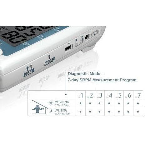 • Diagnostic mode - 7-day implemented self-measurement schedule according ESH/AHA guidelines.