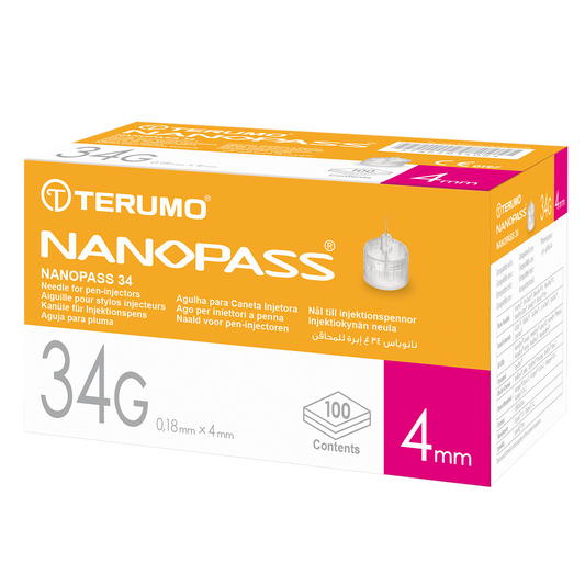 - Although the needle tip is 34G, NANOPASS 34 provides less injection force than a conventional 32G pen needle.