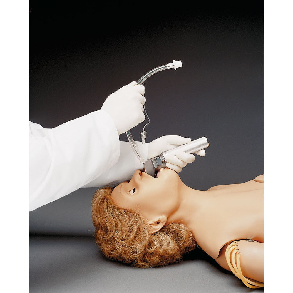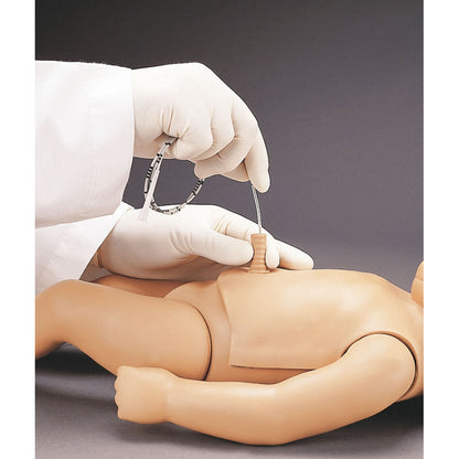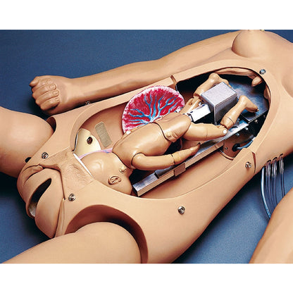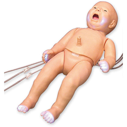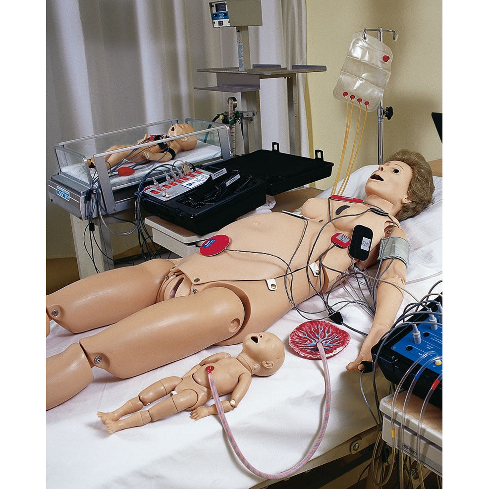 The newborn is intubatable, umbilical catheterisation and IO access can be performed. The simulator comes with four umbilical cords, four dilating cervices, two umbilical clamps, three vulva for postpartum suturing, neonatal monitor, power supply, connecting cables, talcum
