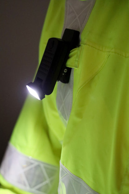 The W1R Work is a handy clip light for policemen, paramedics, security personnel and DIY fans. It can easily be attached at any time by clip or magnet, e.g., to work clothing, caps or metal surfaces. The superior Ledlenser light quality provides precise illumination in two different brightness levels. With its 360° swivel joint and swivelling lamp head, the W1R Work provides light exactly where it is needed. The integrated battery can be charged quickly and easily via USB-C. Other features include a nubbed surface for a strong grip, a handy transport lock and a low battery warning function.