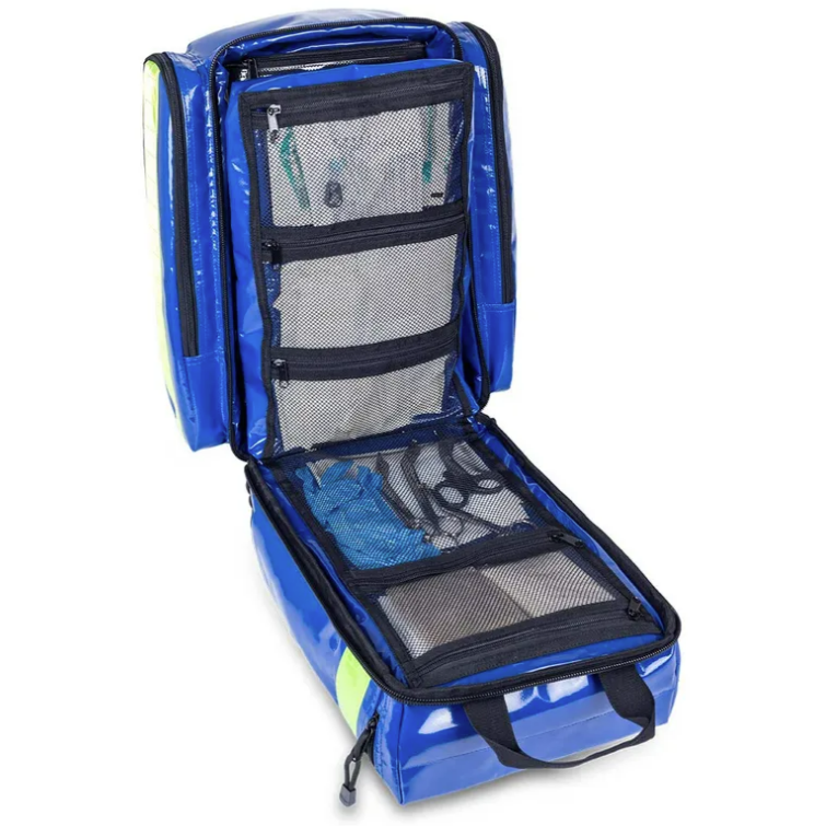 Its main compartment has a flap which divides the main body into two separate high capacity compartments with either mesh or PVC pockets that allow the user to storage all the required medical material and equipment. Its opening system allows to open the bag completely so the user can easily access the content while in an emergency situation.