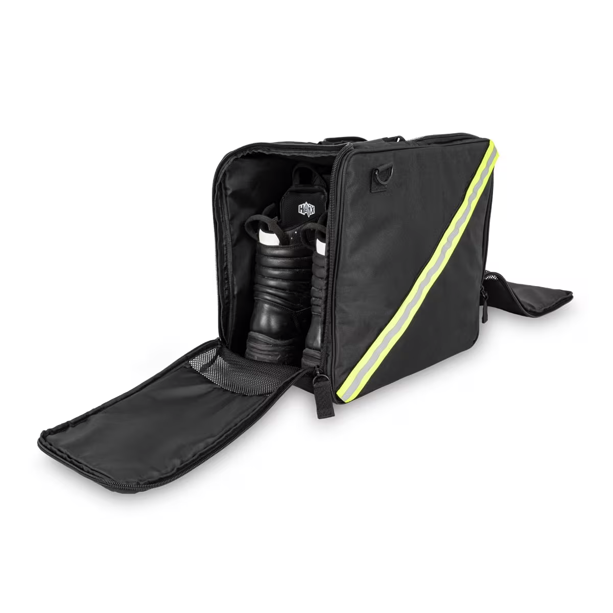 Versatile and durable shoulder bag designed for the secure transport of a helmet and boots in any fieldwork situation. Its practical and compact design allows easy access and organization of personal protective equipment.