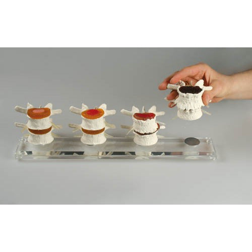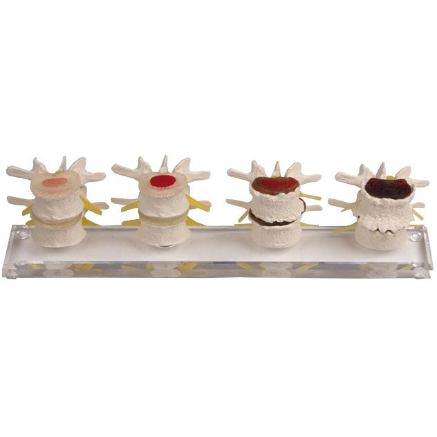 - This model consists of 4 vertebrae pairs and shows additionally to the normal condition three different pathologies: slight disc damage, prolapse with bone degeneration and advanced bone and disc degeneration.
