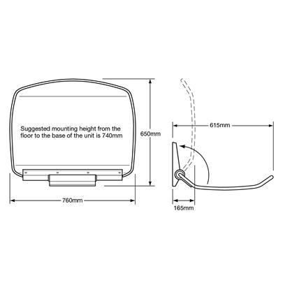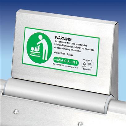 Specification Clause - Manufacturer: Magrini Ltd., Tel: 01543 375311 Fax: 01543 361172. Wall mounted stainless steel baby changing unit, ref: MC75. Size: 760mm (width), 650mm (height), 165mm (closed depth), 615mm (open depth). Material: Stainless steel 1.4301 Dp2 with reinforced cast aluminium hinge system, dual hydro-pneumatic gas strut closing mechanism. Colour option: Stainless steel. Installation kit as supplied by manufacturer. Fully compliant with BS EN 12221:2008 + A1:2013