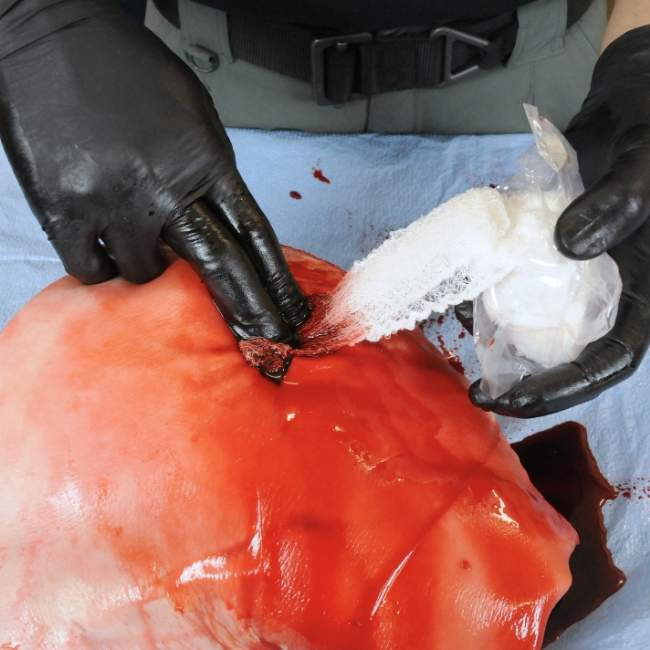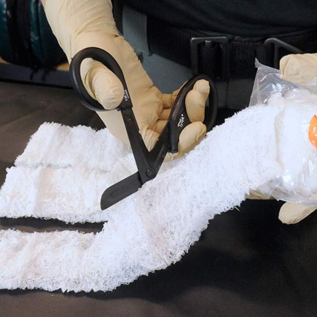 The unique folding and dispensing system makes this compressed gauze the ideal solution for fast and easy wound packing. The system allows gauze to be easily used and cut with virtually no wasted gauze or time. In pre-hospital emergency care scenarios, rolled gauze can become damaged and lose its sterility.