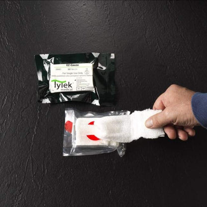 TyTek Medical’s compressed gauze maintains sterility in rugged, compact packaging that facilitates wound packing and wound dressing. In wound packing situations, gauze removal from the wound tract is made easier because EZ-Gauze is a continuous-feed gauze. It is removed in a single continuous piece, as opposed to removing an unknown number of 4×4 gauze pads from the wound.