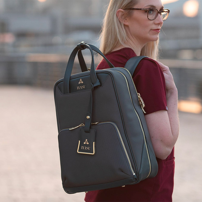 The Elsie vegan medical bag is lightly padded, adjustable backpack straps allow it to be carried ergonomically when walking or cycling but may be tucked away neatly when desired to enable the bag to also be carried as a tote.