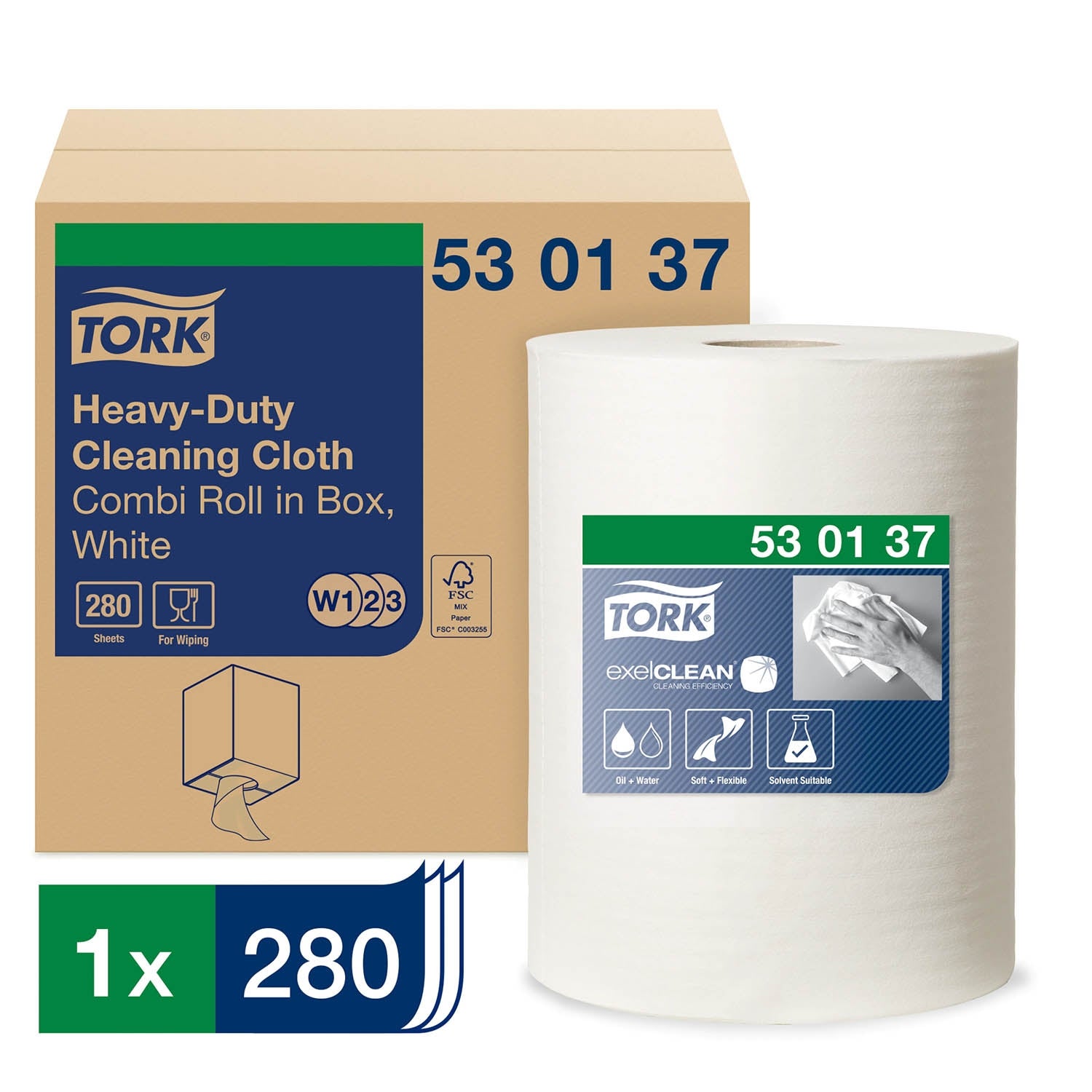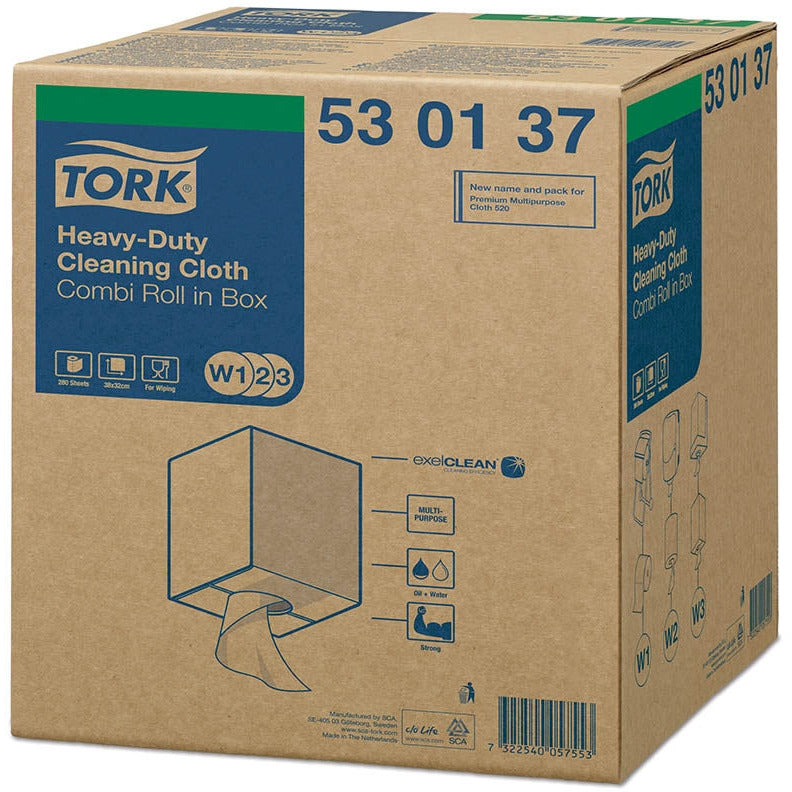 The multi-purpose Tork Heavy-Duty Cleaning Cloth is highly absorbent, thick and very durable, withstanding hard scrubbing without falling apart. It works with most solvents and removes oil, grease, water and stubborn spots quickly and effectively, while protecting hands from heat and metal scraps. This cloth fits in the Tork Floor or Wall Stand dispensers, developed for safety and efficiency, and the Tork Maxi Centrefeed or Boxed Combi Roll Dispenser, designed for single-hand dispensing.