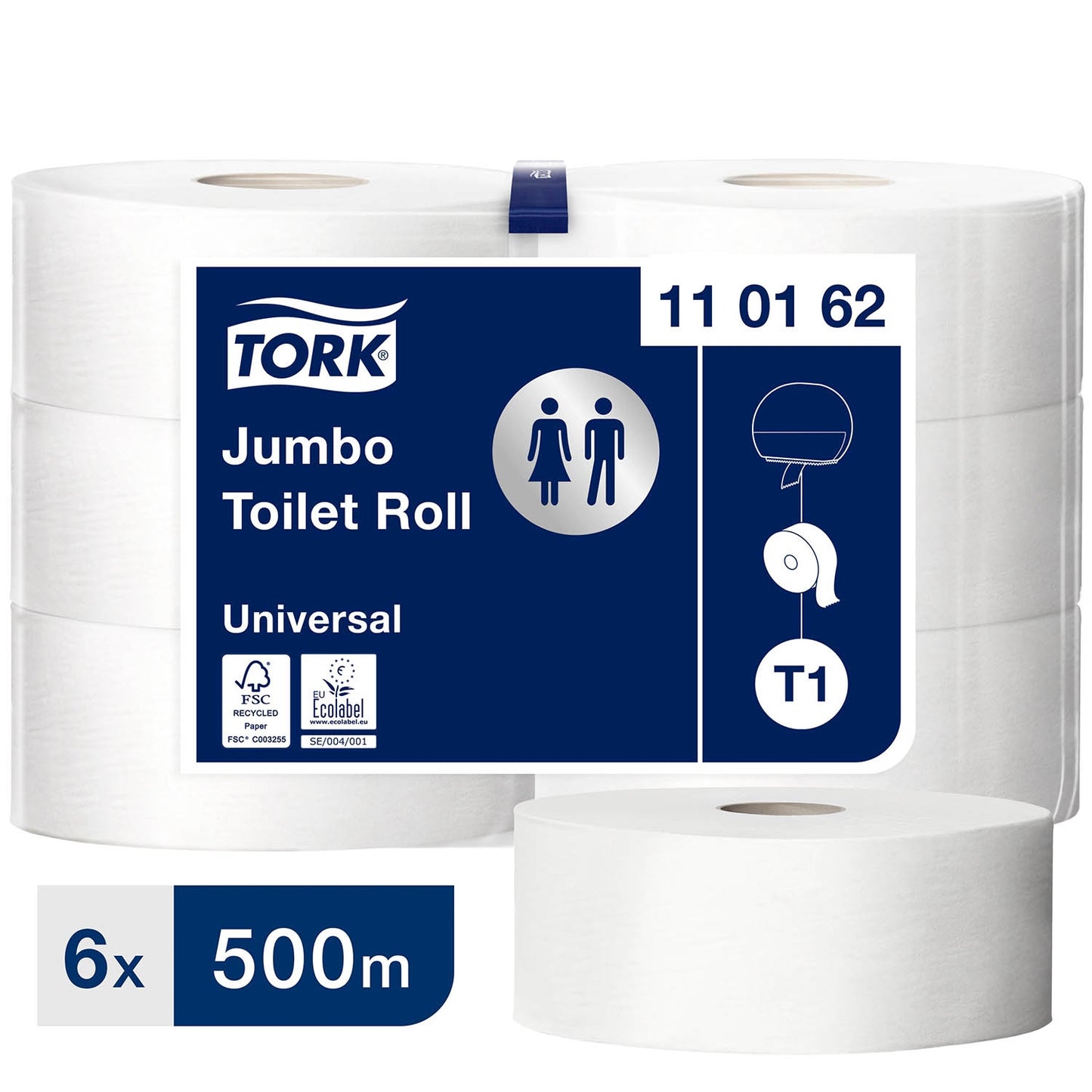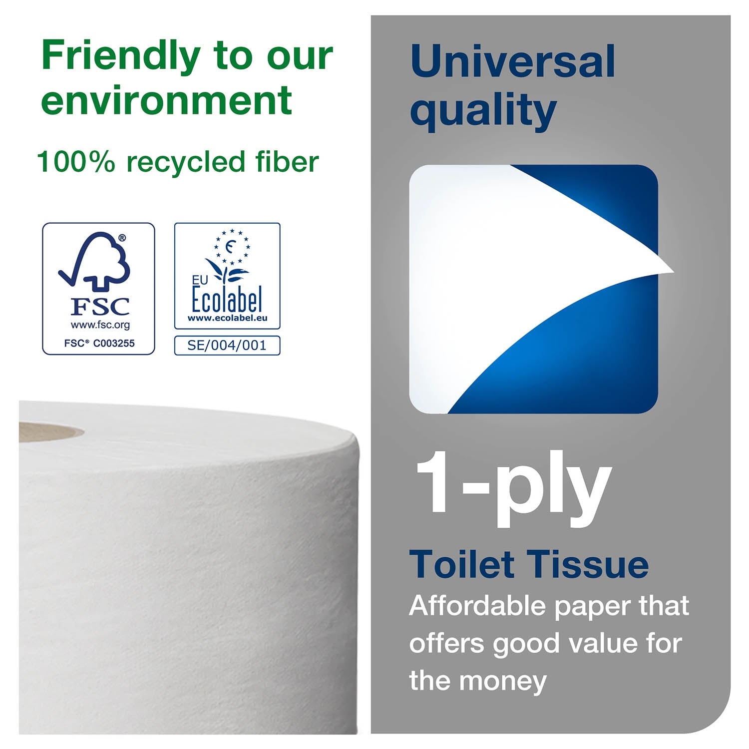 The Tork Jumbo system stands for time efficiency and reduced cost, offering much more toilet paper than standard rolls. Tork Jumbo Toilet Roll Advanced 1-ply balances cost and performance and is ideal for high-traffic locations.