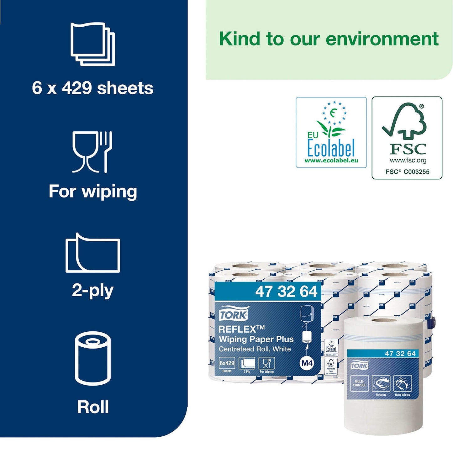 The 2 ply multipurpose Tork Reflex™ Wiping Paper Plus is ideal for mopping up liquids and hand drying. This paper can be used in the Tork Reflex™ single-sheet centrefeed dispenser, which fits your team’s workflow, cuts down consumption and minimises the risk of cross-contamination.