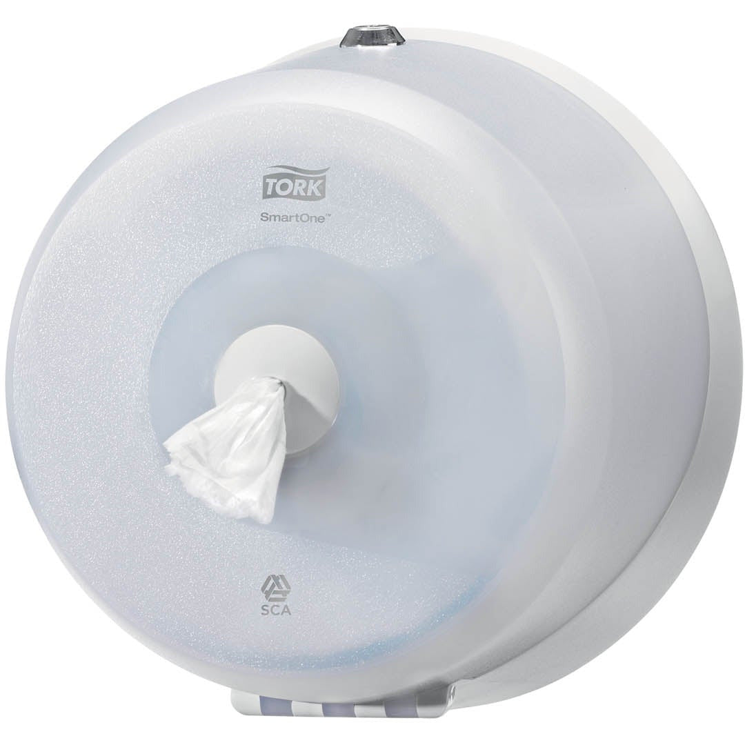 The Tork SmartOne Mini Toilet Roll Dispenser is an efficient and very robust dispensing system suitable for demanding washrooms with low to medium traffic. The sheet-by-sheet dispensing helps to reduce consumption by up to 40 % when compared to traditional jumbo roll dispensers, which means more visits per roll.