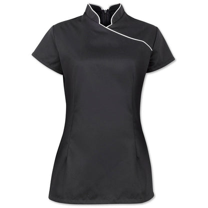 Women’s stand collar beauty tunic suitable for beauty salons, therapists, spas and hairdressers. Features contemporary contrast piping detail and side vents for comfort.