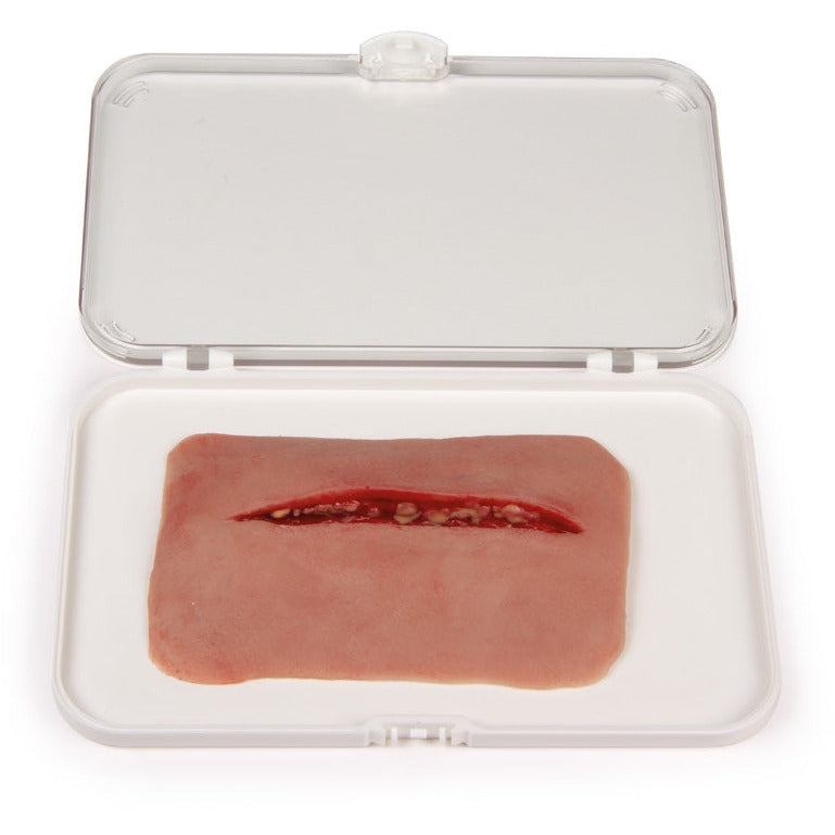 This moulage shows a cut of about 1cm depth. The moulage adheres on human skin or a manikin.